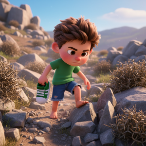 O início da trilha não era tão ruim. Era apenas terra batida e algumas pedras pequenas. Theo, com seu tênis de cano alto, sentia-se confiante. Contudo, conforme ele subia, o caminho se transformava. A terra deu lugar a cascalho solso e pedras pontiagudas. Seus tênis, ótimos para a grama, começaram a escorregar. Um espinho de mandacaru rasgou sua calça e arranhou sua perna, fazendo-o gritar de dor e surpresa. Ele parou, respirando fundo. O caminho era mais íngreme e perigoso do que ele imaginava. Entretanto, a imagem dos garotos mais velhos rindo dele o impulsionou. Ele teve uma ideia péssima: “Se eu tirar os tênis, consigo sentir melhor as pedras e não escorrego!”, pensou. Ele descalçou os sapatos e os amarrou no cinto. A princípio, a sensação de liberdade foi boa. Porém, após alguns passos, as pedras afiadas começaram a machucar a sola de seus pés. Cada passo era uma pequena agulhada.