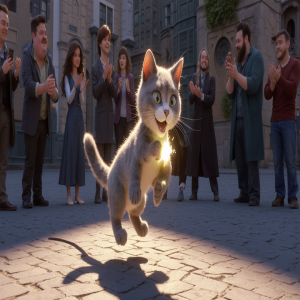 De repente, Jabari, que estava quieto até então, deu um pequeno salto e correu em direção à praça central. Ele estava agitado, como se tivesse percebido algo que ninguém mais havia notado. Dona Flor e Mia o seguiram, e, ao chegar ao local onde Jabari parou, elas viram algo estranho: uma pequena pedra brilhante, meio enterrada no chão.