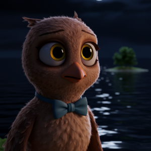 Finalmente, Noctua chegou à beira de um lago escuro. O som triste vinha de uma pequena ilha no meio do lago. Para chegar lá, ela precisaria voar sobre a água escura e profunda. Seu coração acelerou. Ela nunca tinha voado sobre água antes, especialmente à noite.