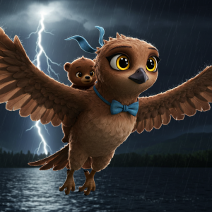 Com cuidado, Noctua colocou o filhote de urso em suas costas e começou a voar de volta para a margem. A chuva caía forte e o vento soprava, tentando derrubá-la. Todavia, Noctua era mais forte do que imaginava. Ela pensou em todos os animais que havia ajudado naquela noite e encontrou coragem para continuar.