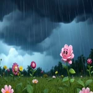 Logo, as primeiras gotas de chuva caíram. Eram pesadas, fortes, diferentes do orvalho delicado que ela tanto apreciava. As pétalas, antes perfeitas, se encharcavam rapidamente, e o caule começou a se inclinar. A Rosa sentiu medo — medo verdadeiro. Pela primeira vez, percebeu que poderia não resistir sozinha.
