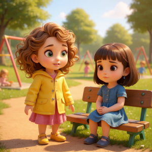 Mais tarde, quando o sol voltou a brilhar, Aurora caminhou até o parquinho do bairro. Lá, as crianças brincavam no balanço, no escorregador e na roda-gigante colorida. Aurora correu para brincar também, mas no caminho encontrou sua amiga Clara sentada sozinha no banco, com lágrimas nos olhos.