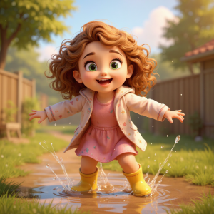 Logo depois, calçou suas botinhas amarelas e saiu para brincar no quintal. O vento começou a soprar forte, bagunçando seu cabelo cacheado. Em seguida, algumas nuvens escuras apareceram, e a chuva caiu de repente, molhando seus brinquedos espalhados pelo jardim. Aurora quase fez uma careta. Podia ficar brava e voltar correndo para dentro.