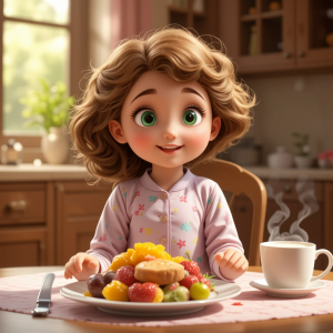 E naquela manhã, o presente já estava pronto na cozinha. O aroma de pão quentinho e café com leite se espalhava pela casa, guiando-a até a mesa. Lá estava mamãe, sorrindo, com frutas coloridas arrumadas em um prato. Aurora sentou-se, deixou os pés balançarem no ar e suspirou, sentindo o coração encher-se de alegria.
