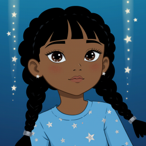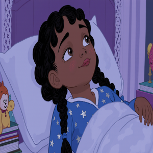 Luiza, uma menininha de sete anos com cabelos pretos cacheados e olhos que brilhavam como pedrinhas de rio, que adora a hora de dormir. Todas as noites, ela se aconchegava em seu edredom macio, todo estampado com nuvens fofas, e observava as sombras dançarem nas paredes do seu quarto. Seu cantinho favorito era perto da janela, onde uma cortina de renda deixava a luz da lua entrar como um véu prateado. Porém, naquela noite, algo diferente acontecia. Apesar do silêncio e do conforto, Luiza sentia sua mente cheia de pensamentos rápidos, como peixinhos pulando num aquário. Ela virou de um lado, depois do outro, tentando afastar a agitação. O quarto, pintado de um azul-claro suave, parecia menor naquele momento. Entretanto, ao olhar para fora, ela viu a lua cheia, redonda e brilhante, como um grande sorriso no céu escuro, e isso trouxe um pequeno conforto ao seu coraçãozinho inquieto.