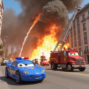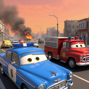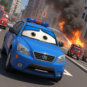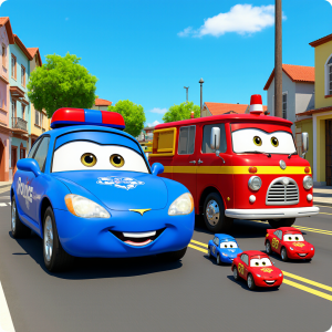 Na Cidade Rodante, onde os veículos são habitantes sorridentes, vivia Policial Azul – um carro de polícia com luzes vermelhas piscantes e um coração valente. Seu melhor amigo era Bombeiro Vermelho, um corajoso caminhão de combate a incêndios, sempre pronto para ajudar. Juntos, eles cuidavam da segurança das ruas coloridas, cheias de casinhas alegres e árvores frondosas. Mas sua maior alegria eram seus “filhos carinhos”: Azulzinho, um pequeno carrinho azul que adorava brincar de esconde-esconde, e Fogueirinha, um carrinho vermelho que sonhava em seguir os passos do pai. Todas as manhãs, a família passeava pelo parque, rindo ao ver as nuvens formatadas como rodas e faróis.