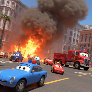 A batalha final aconteceu na praça central. Mestre Rodas armou uma armadilha: um incêndio colossal que ameaçava o parque onde as crianças brincavam. Policial Azul enfrentou os capangas do vilão, enquanto Bombeiro Vermelho lutava contra as chamas. Porém, a água estava quase no fim! As chamas crepitavam, altas e ameaçadoras. Foi quando Azulzinho e Fogueirinha tiveram uma ideia: reuniram todos os carrinhos da cidade – caminhõezinhos, motinhas e até tratores – para formar uma corrente humana e transportar água do rio! Balões, baldes e mangueiras improvisadas passaram de mão em mão (ou roda em roda!). Juntos, eles apagaram o fogo e prenderam Mestre Rodas, que foi levado para a “oficina de reformas”.