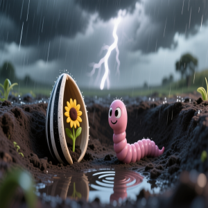 A ajuda de Bartolomeu começou de imediato. Ele cavou pequenos túneis ao redor de Amora, afrouxando a terra e dando a ela espaço para se mover. “Agora, você precisa beber a água da chuva quando ela vier. Ela vai te dar força para abrir sua casca”, explicou ele. E a chuva veio. Foi uma tempestade forte, e a água encheu os túneis que Bartolomeu havia feito. Amora sentiu o pânico tomar conta de si. A água era forte e parecia que ia afogá-la! “Bartolomeu, estou com medo!”, gritou ela. “Não tenha medo, Amora! Use essa força! Deixe a água te alimentar e empurre! Empurre com toda a sua vontade para cima!”, ele gritou de volta, enquanto trabalhava freneticamente para criar bolsas de ar para que ela pudesse respirar. Este era o seu maior desafio. Lutar contra o instinto de se proteger e, ao invés disso, usar o que parecia perigoso – a água torrencial – a seu favor. Com as palavras de Bartolomeu em mente, Amora se concentrou. Ela sentiu a água entrando em sua casca, uma energia nova pulsando dentro dela. Ela juntou todas as suas forças e… CRAC! Sua casca começou a se abrir. Uma pequena raiz branca saiu para baixo, se agarrando à terra, enquanto um minúsculo broto verde começou a lutar para subir, em direção à luz que Bartolomeu prometera.