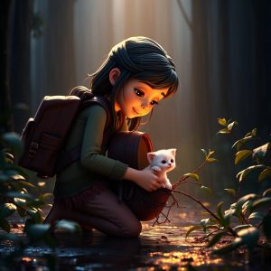 Foi então que ouviu algo estranho: um miado baixinho. Seguindo o som, encontrou um gatinho branco preso entre alguns galhos. Ele estava molhado, tremendo e com os olhos assustados.