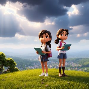 Naquela tarde, a escola organizou um passeio até a colina mais alta da cidade para que os alunos fizessem desenhos da paisagem. Amora adorava pintar, então estava animada. Mas, quando chegaram lá em cima, o vento começou a soprar mais forte e o céu ficou coberto de nuvens pesadas.