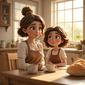 Na cozinha, o cheiro de pão quentinho e café fresco enchia o ar. A mamãe abriu um sorriso suave, mas em seus olhos era possível perceber o peso do cansaço.