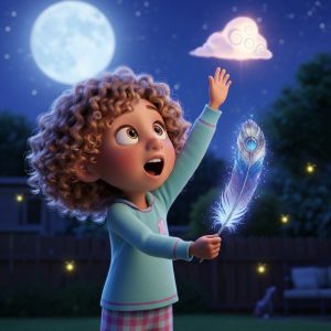Naquela noite, Juliana não conseguia dormir. Ela continuava pensando na nuvem prateada e no Berço de Nuvem. De repente, um leve brilho azul iluminou seu quarto. Juliana sentou-se na cama e viu, assustada, uma pequena pena flutuando no ar. A pena era azul com brilhos prateados, como nada que ela já tinha visto.