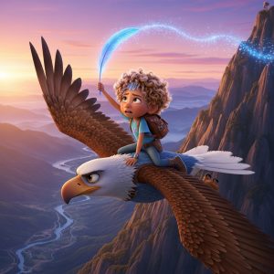Juliana sentiu-se desanimada. Como poderia continuar? Foi quando uma grande águia pousou à sua frente. A águia tinha olhos sábios e penas douradas que brilhavam sob a luz da lua. Com a cabeça, a águia convidou Juliana para subir em suas costas. Com um pouco de medo, porém muita coragem, Juliana montou na águia, que a levou voando sobre o abismo até o topo da montanha.