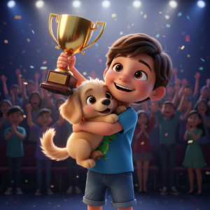 Quando a risada e os aplausos diminuíram, os juízes, ainda com almofadas na cabeça, se entreolharam e sorriram. O juiz principal pegou o microfone. “Caramelo”, ele disse, “você não sabe buscar, não sabe rolar e certamente não sabe cantar. Porém, você nos deu algo muito mais raro e valioso hoje: você nos deu uma risada genuína e pura. Você nos mostrou que a felicidade não vem da perfeição, mas de ser autêntico.”. Ele se levantou e entregou a Miguel um troféu dourado e brilhante. Não era o troféu de primeiro lugar. Na base, estava gravado: “Prêmio de Maior Alegria”. Os olhos de Miguel se encheram de lágrimas, mas desta vez, eram lágrimas de felicidade. Ele abraçou Caramelo com tanta força que o filhote soltou um pequeno “au!” de surpresa. “Você é o melhor cachorro do mundo, Caramelo! O melhor de todos!”, sussurrou ele no pelo do seu amigo. No caminho de volta para casa, com o troféu no colo de Miguel, Caramelo se sentia diferente. Ele olhava para o mundo pela janela do carro e via tudo com novos olhos. Ele percebeu que sua “atrapalhação” não era um defeito, mas sua maior qualidade. Era o que o tornava único, o que fazia as pessoas rirem e se sentirem felizes. Ele não precisava ser como os outros cães; ele só precisava ser Caramelo. Ao chegar em casa, Miguel colocou o “Prêmio de Maior Alegria” na prateleira da sala, bem no centro, acima de todos os outros troféus de futebol e ciências que sua família tinha. Caramelo deitou-se em seu tapete favorito, observando o troféu brilhar sob a luz da lâmpada. Ele finalmente entendia. A maior magia não está em ser perfeito, mas sim em celebrar exatamente quem você é, com cada tropeço e cada imperfeição cheia de charme. E ele, Caramelo, o cãozinho mais desastrado que já existiu, acabara de desvendar seu mais valioso tesouro: o dom de ser feliz de verdade e, com isso, fazer o mundo ao redor sorrir um pouco mais.