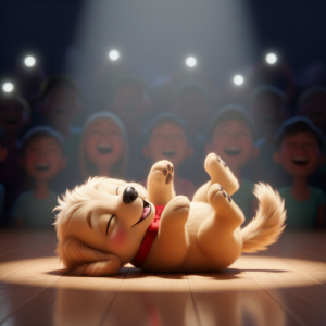 O dia do show chegou. O auditório da escola estava lotado de crianças, pais e professores. O palco era iluminado por holofotes brilhantes que pareciam olhos gigantes. Caramelo, com uma fita vermelha amarrada em seu pescoço, tremeu atrás das cortinas. Um por um, os animais se apresentaram. Um gato siamês chamado Luna equilibrou-se perfeitamente em uma bola azul, enquanto um papagaio chamado Zé recitou o alfabeto de trás para a frente. A plateia aplaudia entusiasticamente a cada performance perfeita. Então, o apresentador gritou: “E agora, Miguel e seu cachorro, Caramelo!”. O coração de Caramelo disparou. Ele e Miguel caminharam para o centro do palco. As luzes estavam quentes, os rostos da plateia eram uma mancha borrada. Miguel, sentindo o nervosismo de Caramelo, se ajoelhou e sussurrou: “Está tudo bem, garoto. É só eu e você.”. A música começou a tocar – uma canção animada e boba. Caramelo tomou uma respiração profunda e lembrou-se de sua promessa. Ele não tentou fazer um truque. Ele apenas se moveu. Ele começou a abanar o rabo com tanta força que todo o seu corpo começou a balançar. Ele deu um passo para a frente, mas tropeçou nas próprias patas e começou a deslizar pelo palco polido, como se estivesse patinando. A plateia soltou uma risada. Em vez de se envergonhar, Caramelo abraçou o momento. Ele se levantou, tonto, e tentou girar, o que resultou em uma série de cambalhotas descontroladas e engraçadas. Ele correu em círculos, quase caiu da borda do palco (para o susto de Miguel), e depois correu de volta para o centro, onde ele escorregou novamente e acabou deitado de costas, com as quatro patas no ar, abanando como se não houvesse amanhã. Sua performance não era habilidosa; era um caos cômico e cheio de alegria. As crianças na plateia estavam rindo tanto que algumas caíram das cadeiras. Até os professores sorriam. Em seu último ato de pura desajeitação, ele se levantou, correu e acidentalmente bateu em uma pilha de almofadas de palco, que voaram para o ar e pousaram perfeitamente na cabeça dos juízes. O silêncio tomou conta por um segundo, antes que o auditório explodisse em aplausos e gargalhadas.