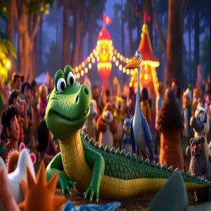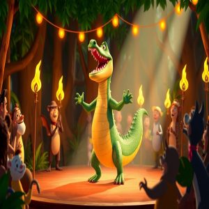 Chegou o dia do festival. A clareira estava iluminada com tochas, e os animais se reuniam em roda. Apresentações maravilhosas encheram o ar de música e alegria. Quando anunciaram o nome de Samuel, todos se entreolharam: “Um jacaré vai dançar?” Alguns riram, outros cochicharam assustados.