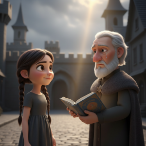 O clímax de sua jornada aconteceu quando, de forma inesperada, o próprio portão do castelo se abriu. O Rei, um homem mais velho de cabelos brancos e um rosto marcado por uma tristeza antiga, saiu para seu passeio matinal. Seus olhos caíram sobre a pequena Helena, parada desafiadoramente na frente de seus guardas. “O que se passa aqui?”, perguntou ele, com uma voz que era calma, mas carregada de peso. Os guardas se endireitaram, mas Helena, antes que pudessem falar, deu um passo à frente. “Majestade”, disse ela, “eu vim trazer uma coisa para o Senhor”. E, com mãos que tremiam, ela lhe entregou o livro de contos de fadas. O Rei olhou para o objeto colorido como se fosse uma criatura alienígena. Ele o pegou com cuidado, e seus olhos percorreram as páginas. Helena viu uma lágrima solitária escorrer por sua face enrugada. “Onde… onde você arranjou isso?”, ele sussurrou. “No sótão”, respondeu ela. “Eu acho que o reino está esquecendo de como ser feliz.” O Rei fechou o livro e olhou para Helena, e pela primeira vez em um século, seus olhos não estavam vazios, mas sim cheios de uma dor profunda. “Nós não esquecemos, menina. Nós abandonamos. A alegria nos trouxe uma dor tão insuportável que preferimos o vazio a arriscar sentir novamente.” Helena olhou para ele, e em vez de argumentar, ela fez a coisa mais simples e corajosa que podia. Ela abriu um sorriso grande, genuíno e cheio de calor, um sorriso que não pedia nada em troca, apenas oferecia um pouco de luz.