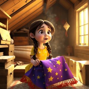 Numa tarde chuvosa, enquanto mexia nas gavetas antigas do sótão, Ester encontrou um embrulho de tecido dourado. Quando abriu, ficou de boca aberta: era um tapete colorido, com desenhos de estrelas brilhantes e bordas que pareciam dançar. O tecido era tão macio que parecia vivo.