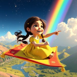 O tapete voador encantado voava leve, quase como se fosse uma música. Ester via lá embaixo rios que brilhavam como prata e montanhas que pareciam cobertas de açúcar. Passaram por um arco-íris tão perto que ela quase conseguiu tocar. Cada cor vibrava e soltava um perfume diferente: o vermelho cheirava a morango, o azul lembrava o mar, o amarelo tinha aroma de limão doce.