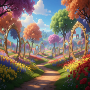 Mas o que realmente chamou a atenção deles foram os espelhos. Centenas, espalhados pelo vale como guardiões silenciosos. Havia espelhos altos e estreitos, além de outros pequenos e arredondados, todos decorados com criaturas misteriosas, flores mágicas e símbolos de uma linguagem esquecida.