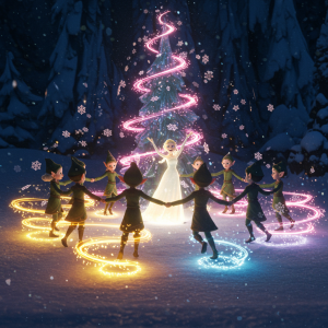 De repente, algo mágico aconteceu. A neve que cobria o chão começou a subir, formando figuras dançantes no ar. Era como se a própria neve estivesse celebrando com eles. Os elfos riam, e seus risos se misturavam à música, criando uma sinfonia de pura felicidade.