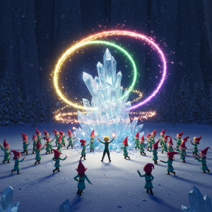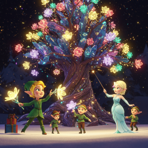 No cume da Montanha de Cristal, onde os raios de sol teciam fios de ouro sobre a neve, transformando cada flocão em um diamante cintilante, habitava uma aldeia de elfos. Eram seres de estatura diminuta, com orelhas afiadas como folhas de salgueiro e olhos que guardavam o brilho de estrelas recém-nascidas. Cada um deles pulsava com uma alegria contagiante e possuía um dom único: uns faziam a luz contorçar-se em danças hipnotizantes, outros transmutavam a neve em flocos de rubi, safira e esmeralda, e alguns, com um leve assobio, faziam brotar flores de gelo que exalavam partículas luminosas pelo ar.