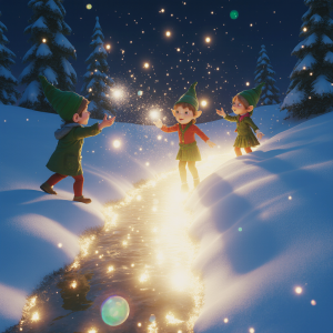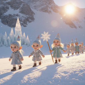 Com passos leves e animados, os elfos começaram a descer a montanha. O ar estava frio, mas seus corações estavam quentes de emoção. Ao longo do caminho, a neve parecia dançar ao redor deles, girando em redemoinhos prateados e dourados. Os elfos riam, jogando bolas de neve que explodiam em flocos cintilantes ao tocar o chão.