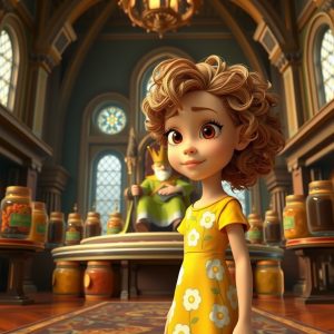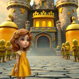 Finalmente, ela chegou ao Castelo da Mostarda, uma construção impressionante feita inteiramente de potes de mostarda dourada. Os guardas na entrada eram picles em forma de soldados, marchando de um lado para o outro.