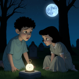 Eles esperaram até o anoitecer e foram ao cemitério. O lugar estava silencioso e escuro, porém o relógio emitia um brilho suave que iluminava o caminho. Eles encontraram o túmulo da bisavó de Clara, e Pedro colocou o relógio sobre a lápide.